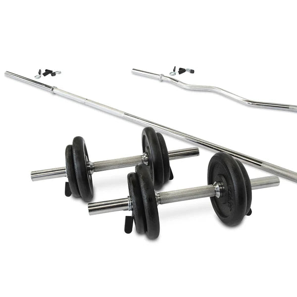 Le kit comprenant une barre d'haltères standard, une barre EZ Curl et des haltères est un ensemble complet d'entraînement de musculation qui inclut tout le nécessaire pour développer vos muscles et augmenter votre force. Ce kit contient une barre d'haltères standard, une barre EZ Curl et un assortiment d'haltères de différents poids.